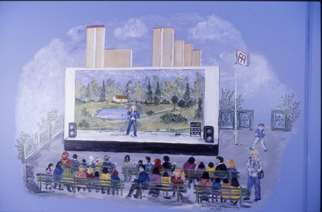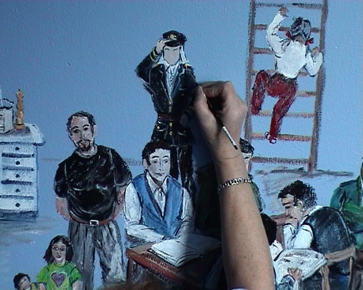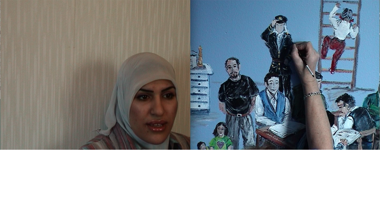 Ersen endeavors to analyze the region through the view of local children, by interviewing at length two girls on their thoughts on the paintings which decorate the stairways of their flats. These paintings were done in the beginning of 1990s by a Swedish gardener with a talent for painting, whose work also involved renovating buildings in the area. The gardener finds inspiration through the images in immigrants’ memories of their native land. However, the paintings show a typical Swedish nature paintings with no relation to the places from where they emigrated. In a sense, the gardener’s own memories have distorted and transformed the places described to him.